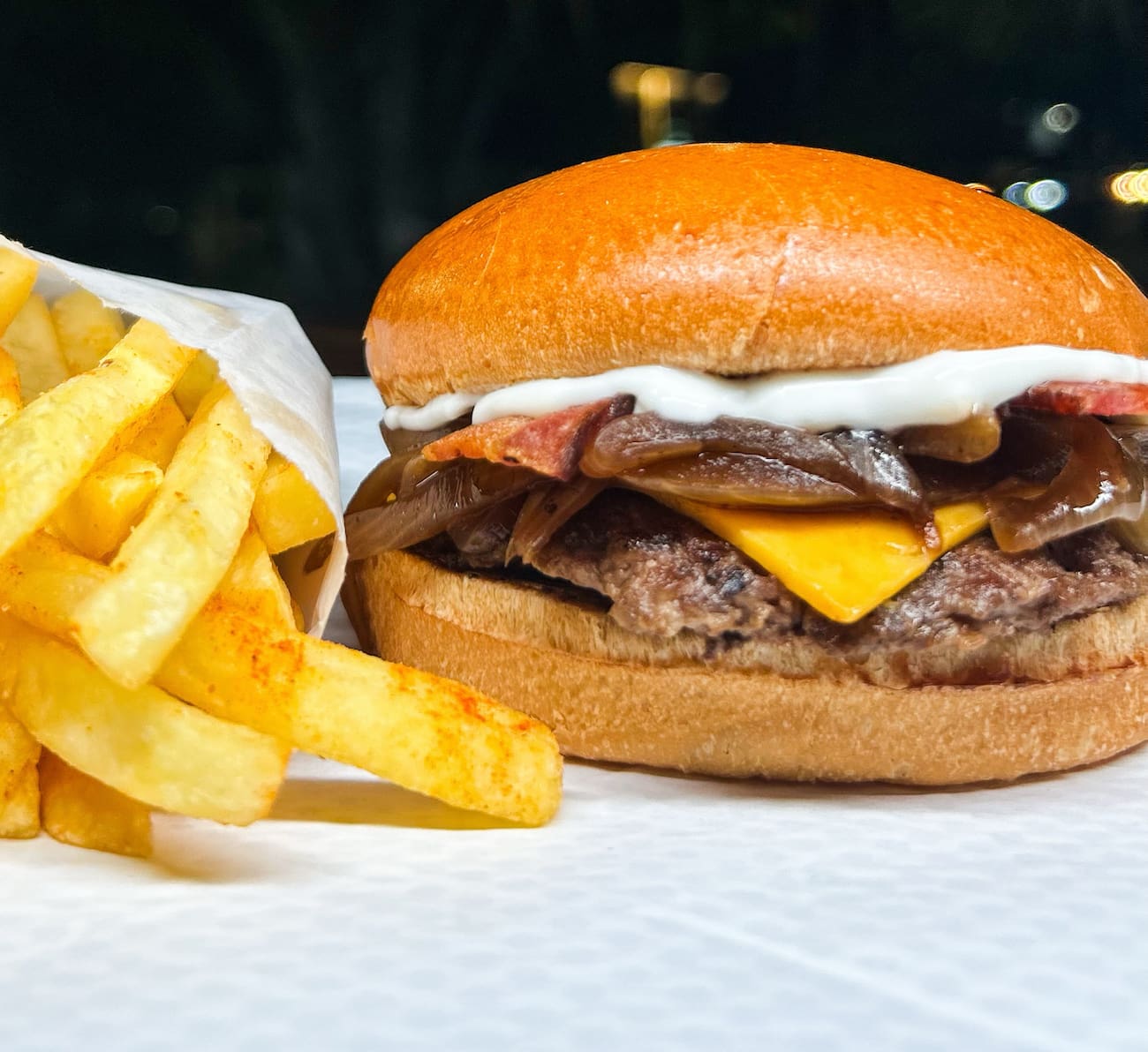 Pão brioche especial, 2 Hamburguer 80g, Molho Aioli Original, Queijo cheddar, Cebola Caramelizada e Bacon.