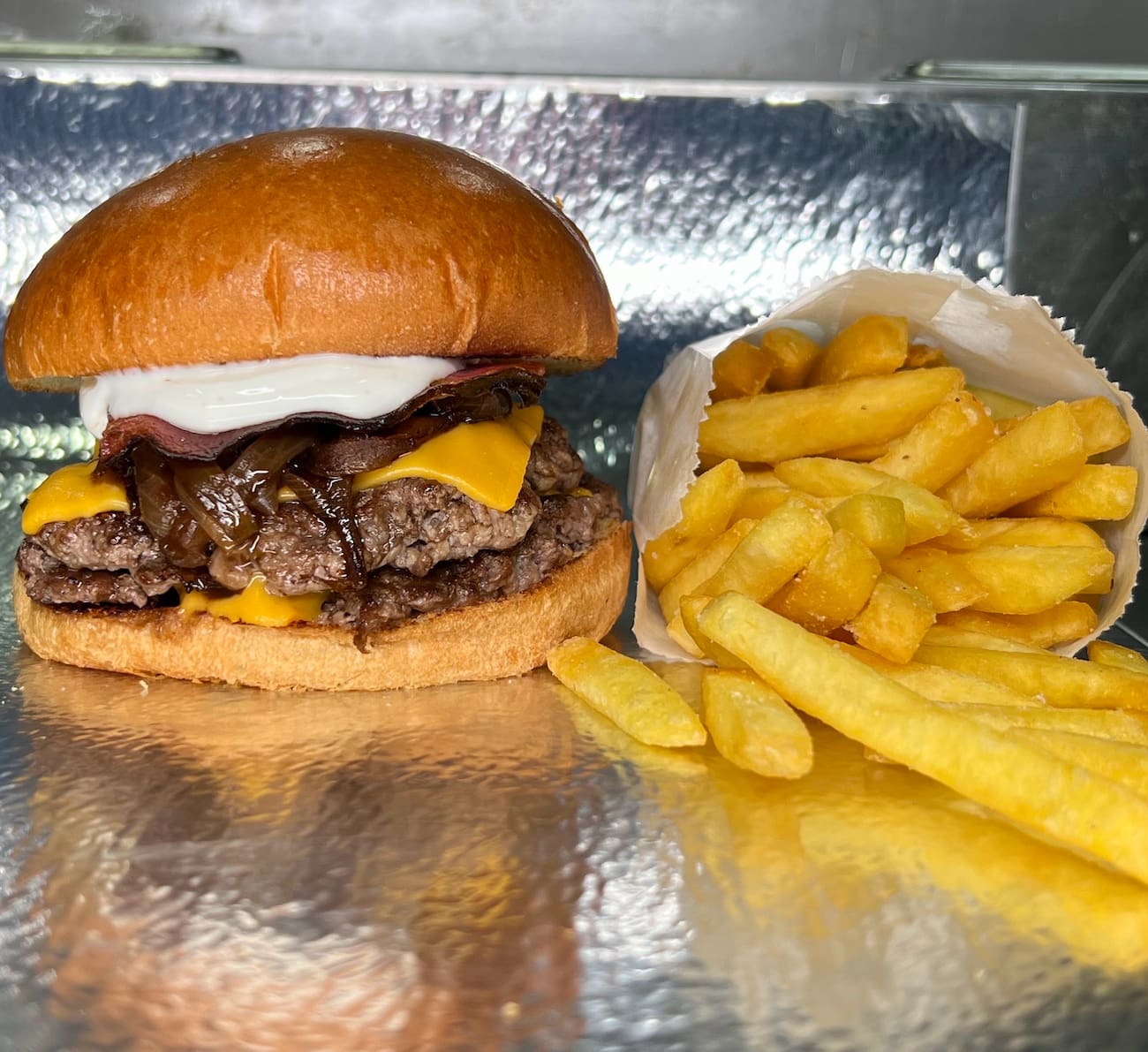 Pão brioche especial, 2 Hamburguer 80g, Molho Aioli Original, Queijo cheddar, Cebola Caramelizada.